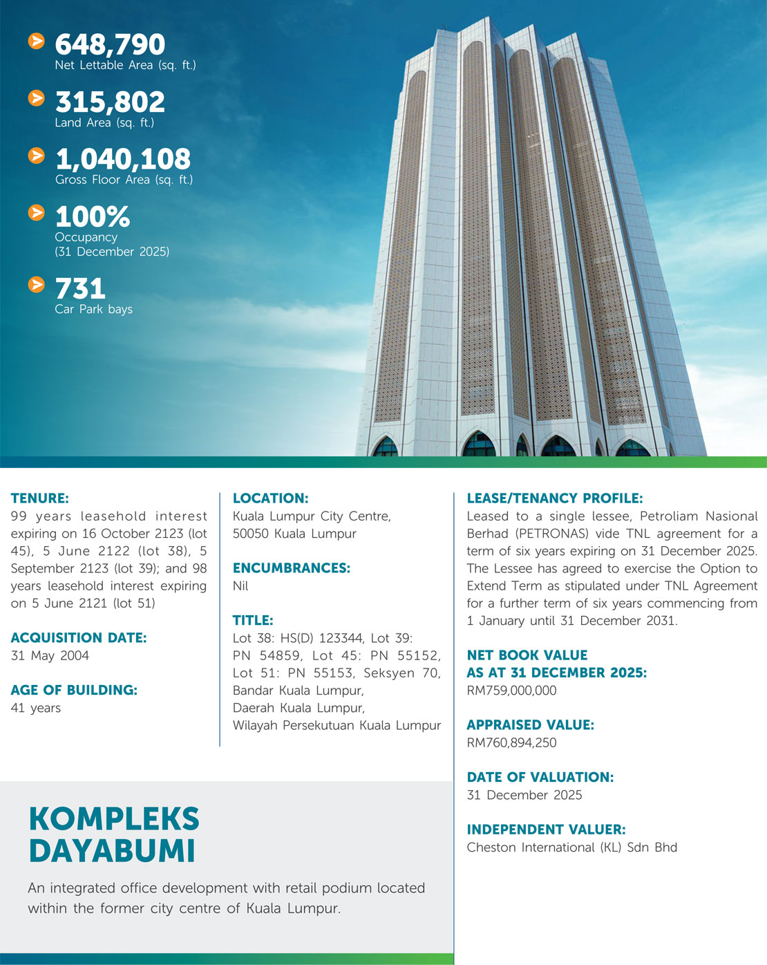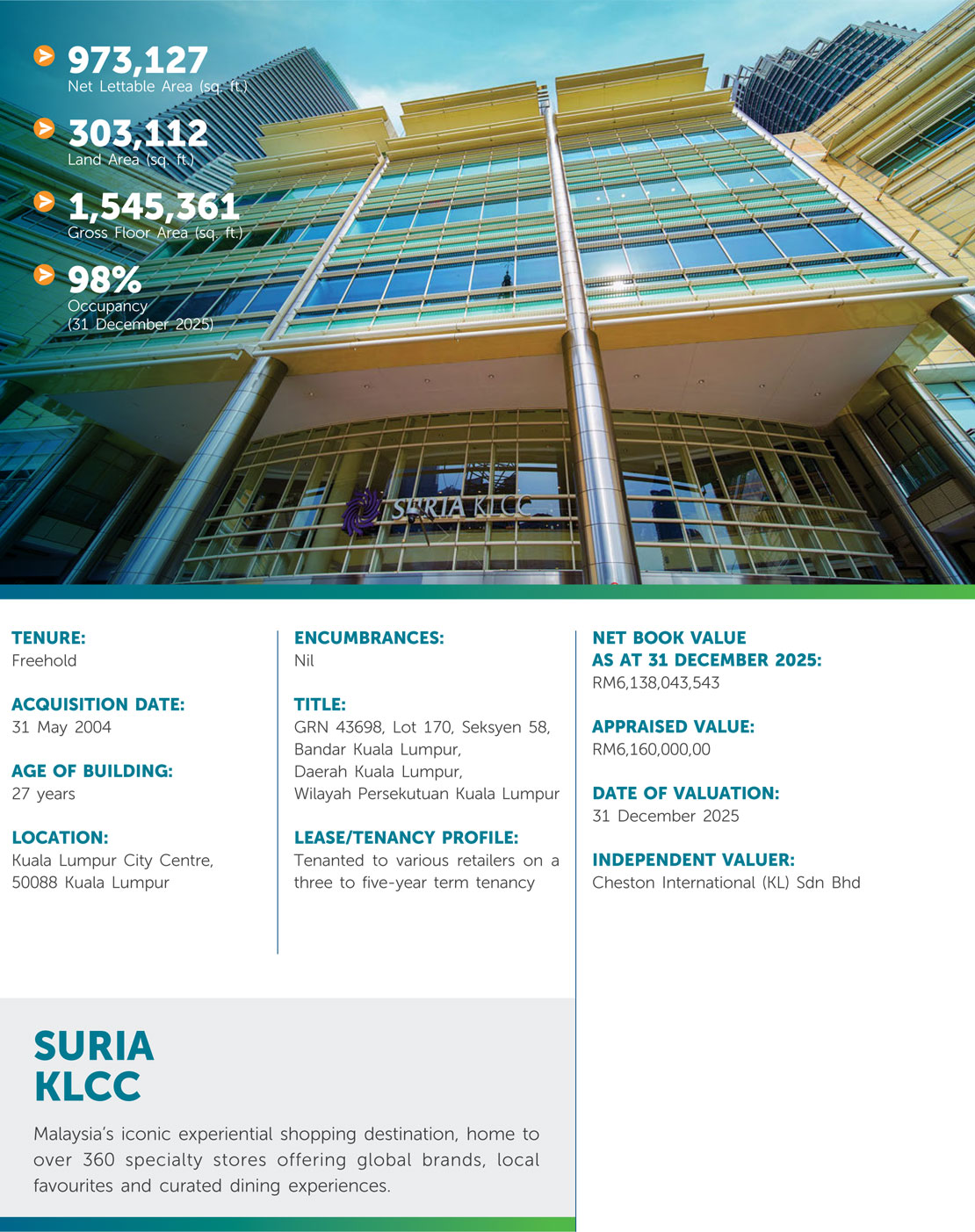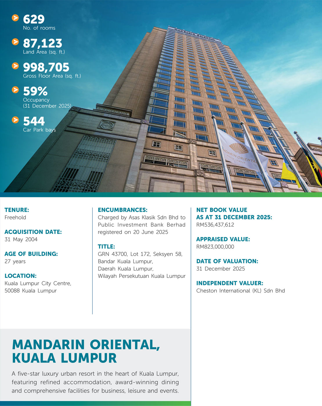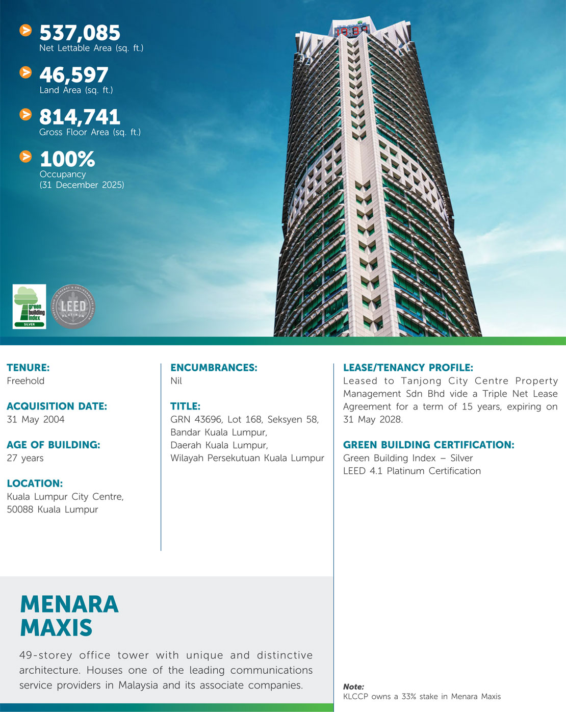 KLCCP owns a diverse property portfolio largely within the KLCC Development comprising Suria KLCC (a leading shopping mall) and Mandarin Oriental, Kuala Lumpur (a luxury hotel). KLCCP also owns a 33% interest in Menara Maxis. Beyond the KLCC Development, KLCCP owns Kompleks Dayabumi, which is located within the older commercial area of Kuala Lumpur.