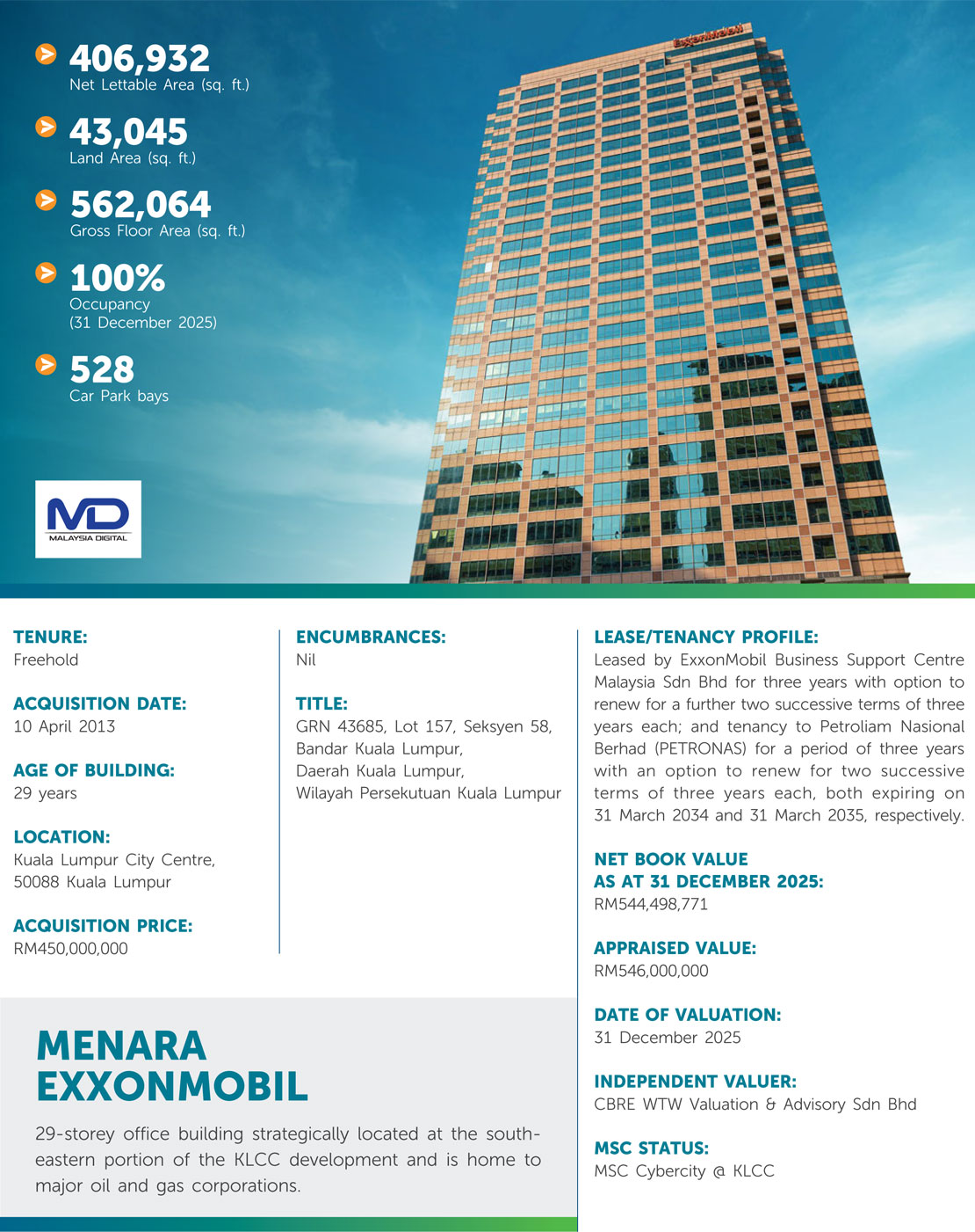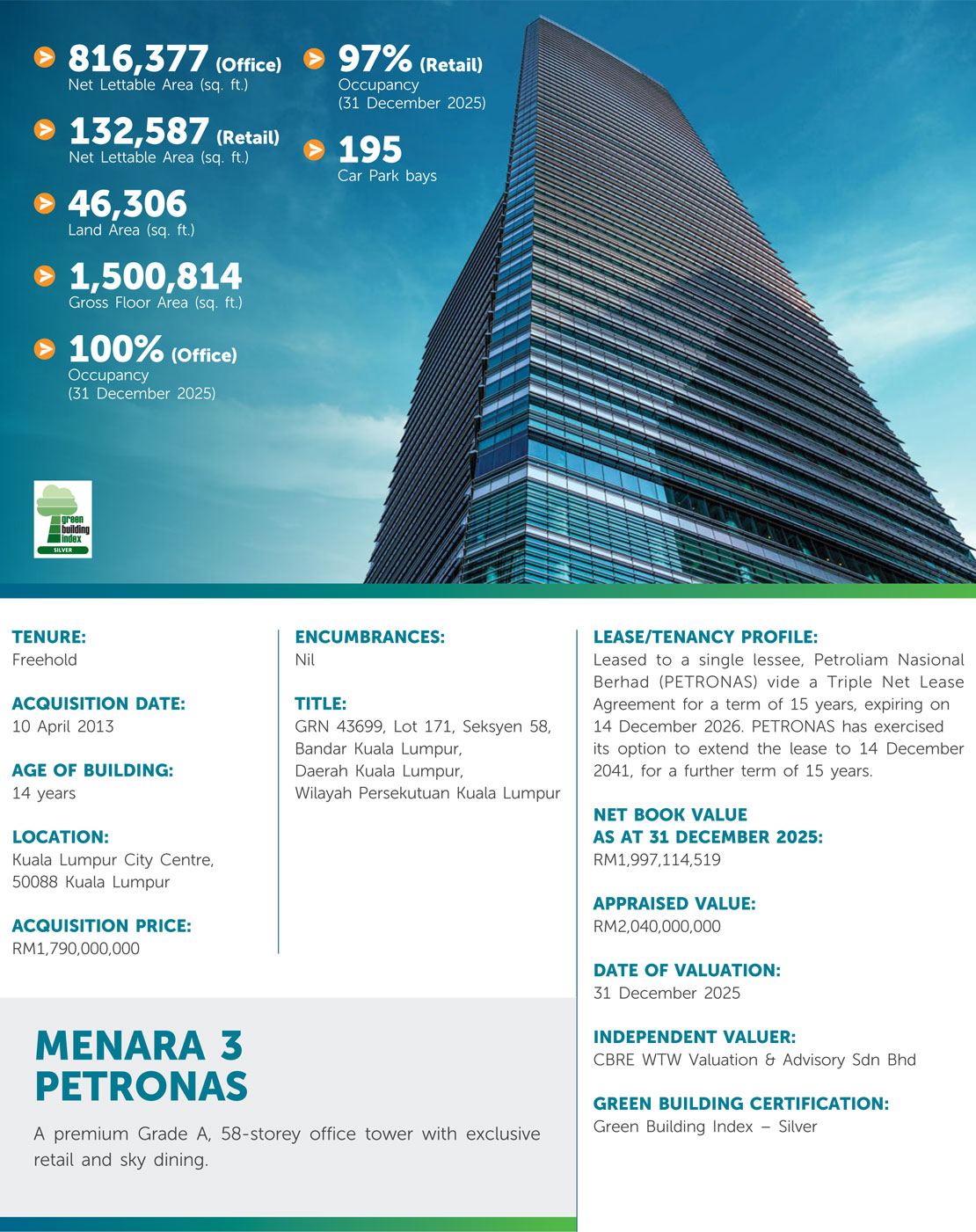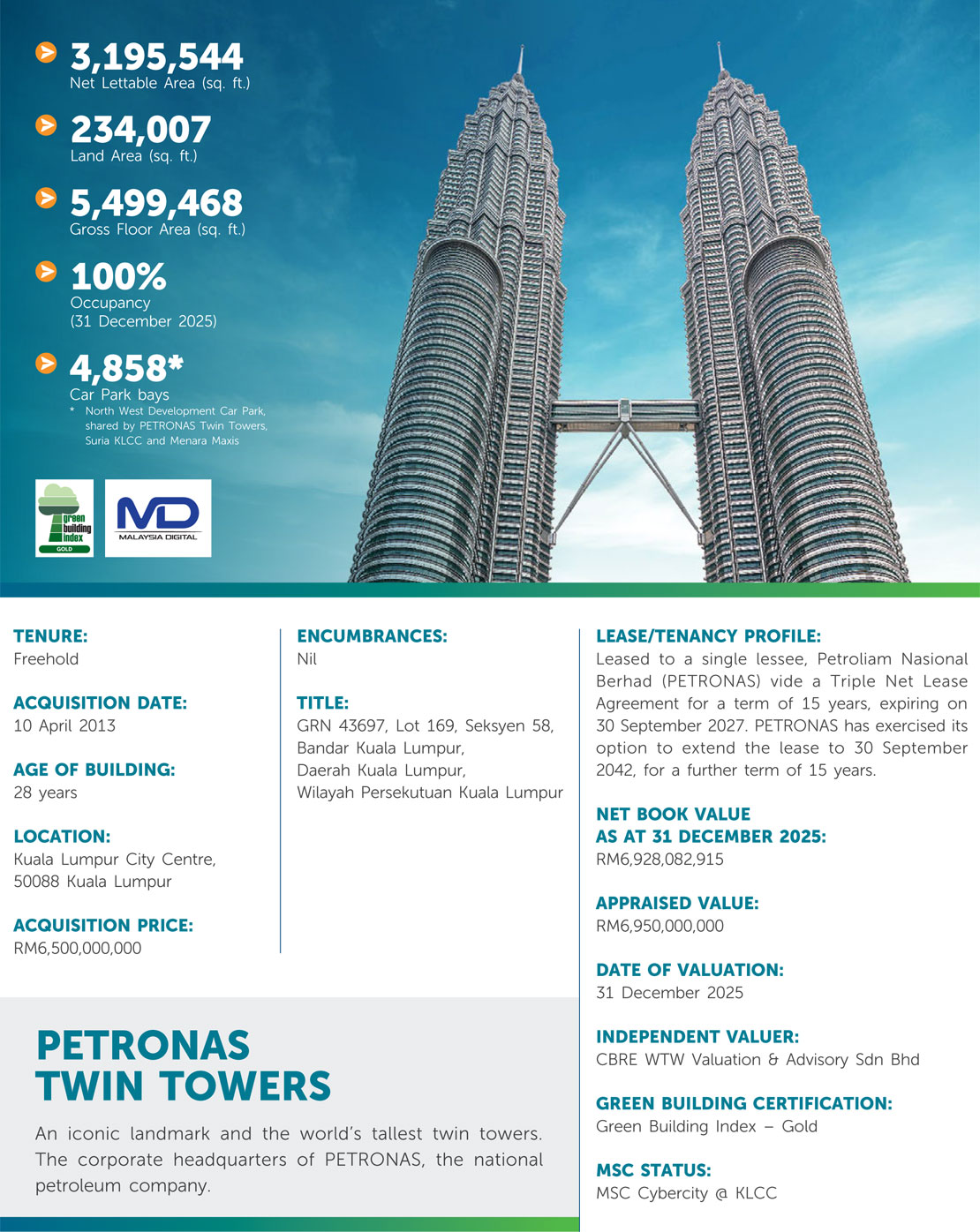 The properties have a combined Net Lettable Area (NLA) of over 4.55 million sq. ft. within the 100-acres KLCC Development which ranks among the largest real-estate developments in the world. KLCC is designed as a place where people can work, live, shop, meet, relax, eat and enjoy the leisure and cultural activities in a convenient and pleasant environment.